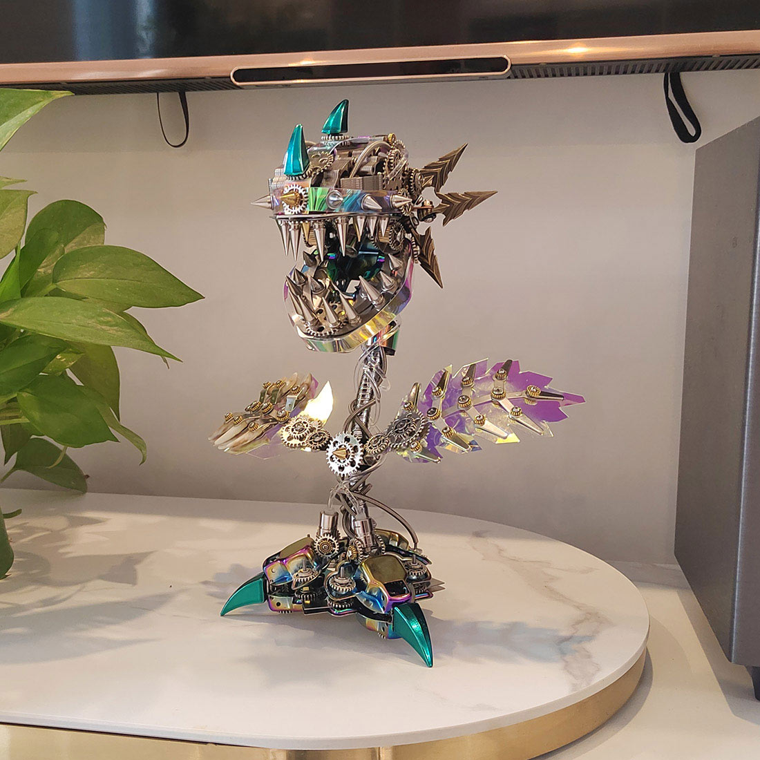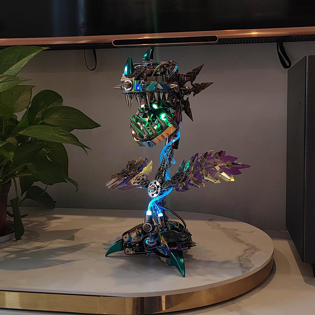 .Lifelike Detailing: Made with high-quality metal materials, the model is sturdy and durable, showcasing unparalleled craftsmanship. With colorful LED strips surrounding its body and colored bulbs in its eyes, the man-eating flower model glows brilliantly even in the dark, creating a mysterious and romantic atmosphere.