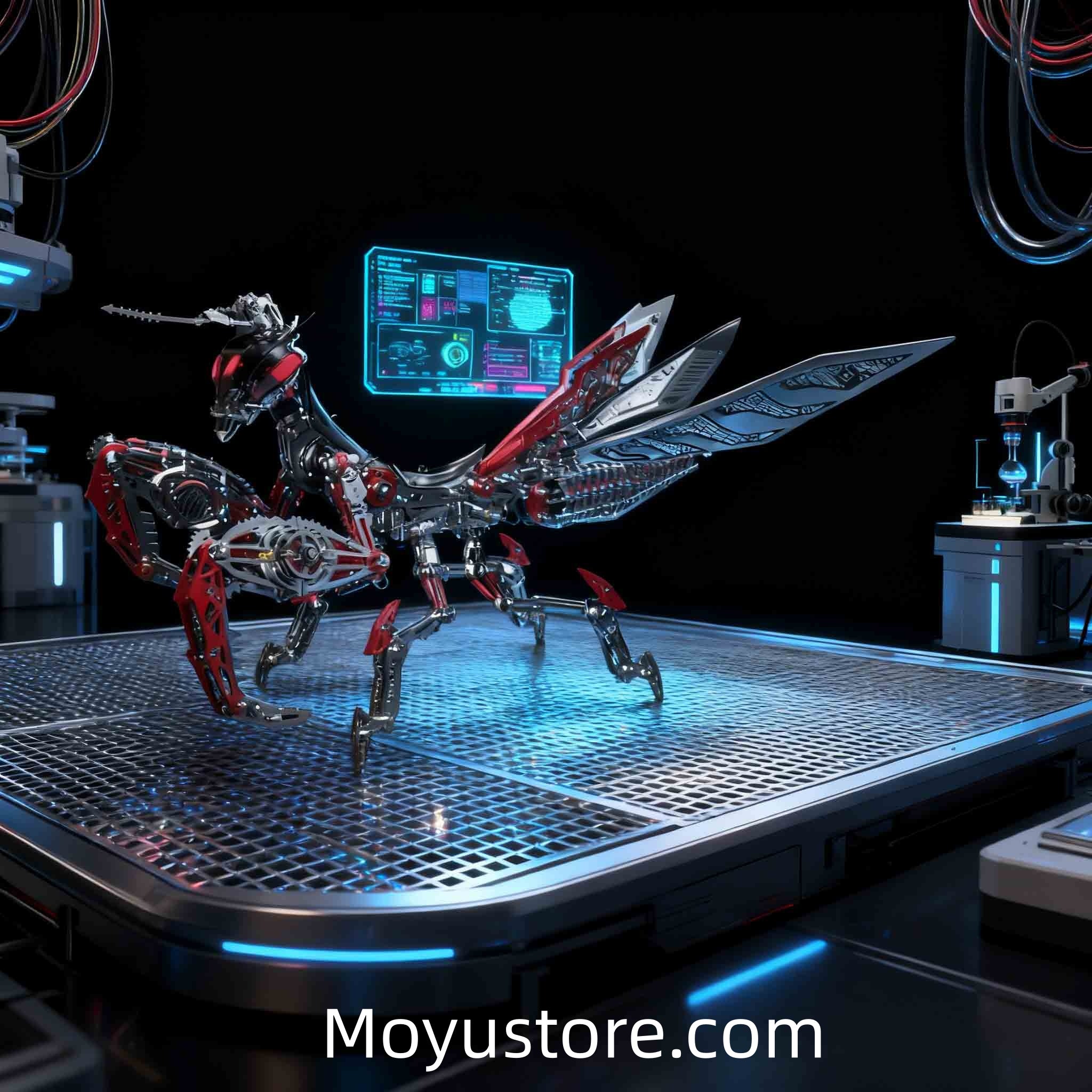 In a future where machines dominate the battlefield, engineers sought to recreate the perfect predator. From steel and fire was born the Black & Red Mechanical Mantis—a cybernetic hunter forged for speed and power.