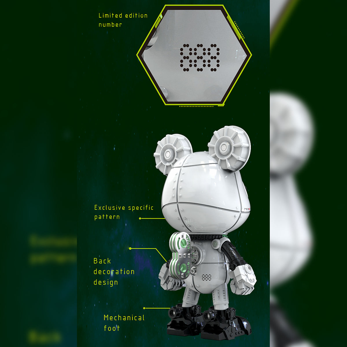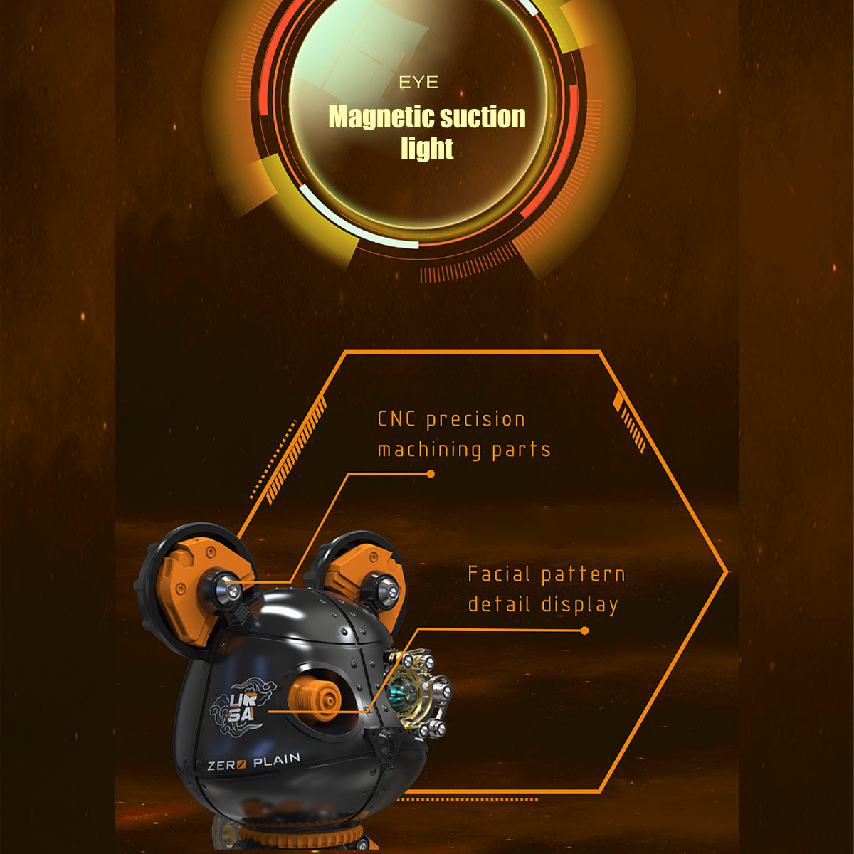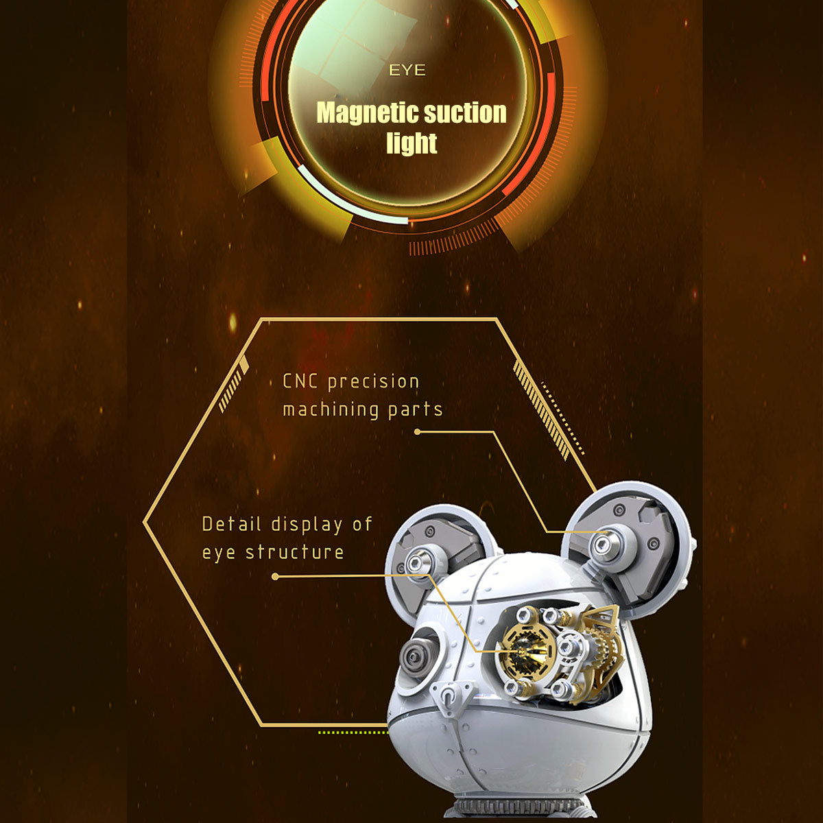 .Interactive Light Features: The bear’s eyes are equipped with magnetic lights, and the body features a magnetic-controlled light system. The interactive lighting adds an extra layer of fun, with light effects that increase the sci-fi and mysterious vibe, especially when displayed in low light.