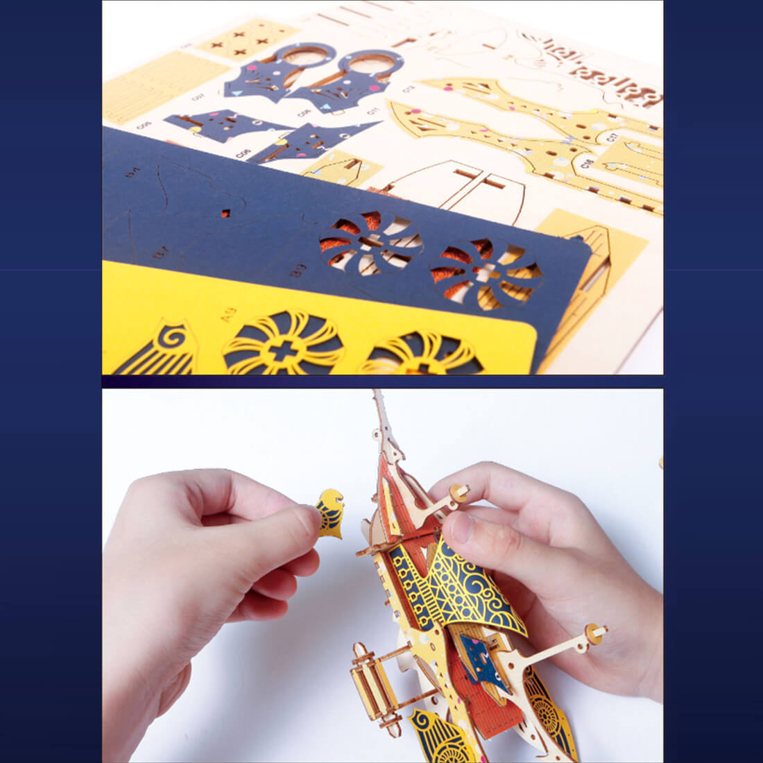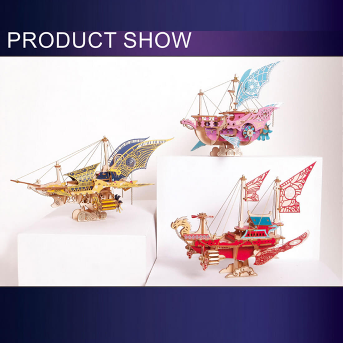.Made of eco-friendly bamboo, inspired by the folk song the fantasy ship kit adopts physical mortise and tenon structure an is easy and safe to play. Embark on a journey of Victorian and steampunk fantasy.