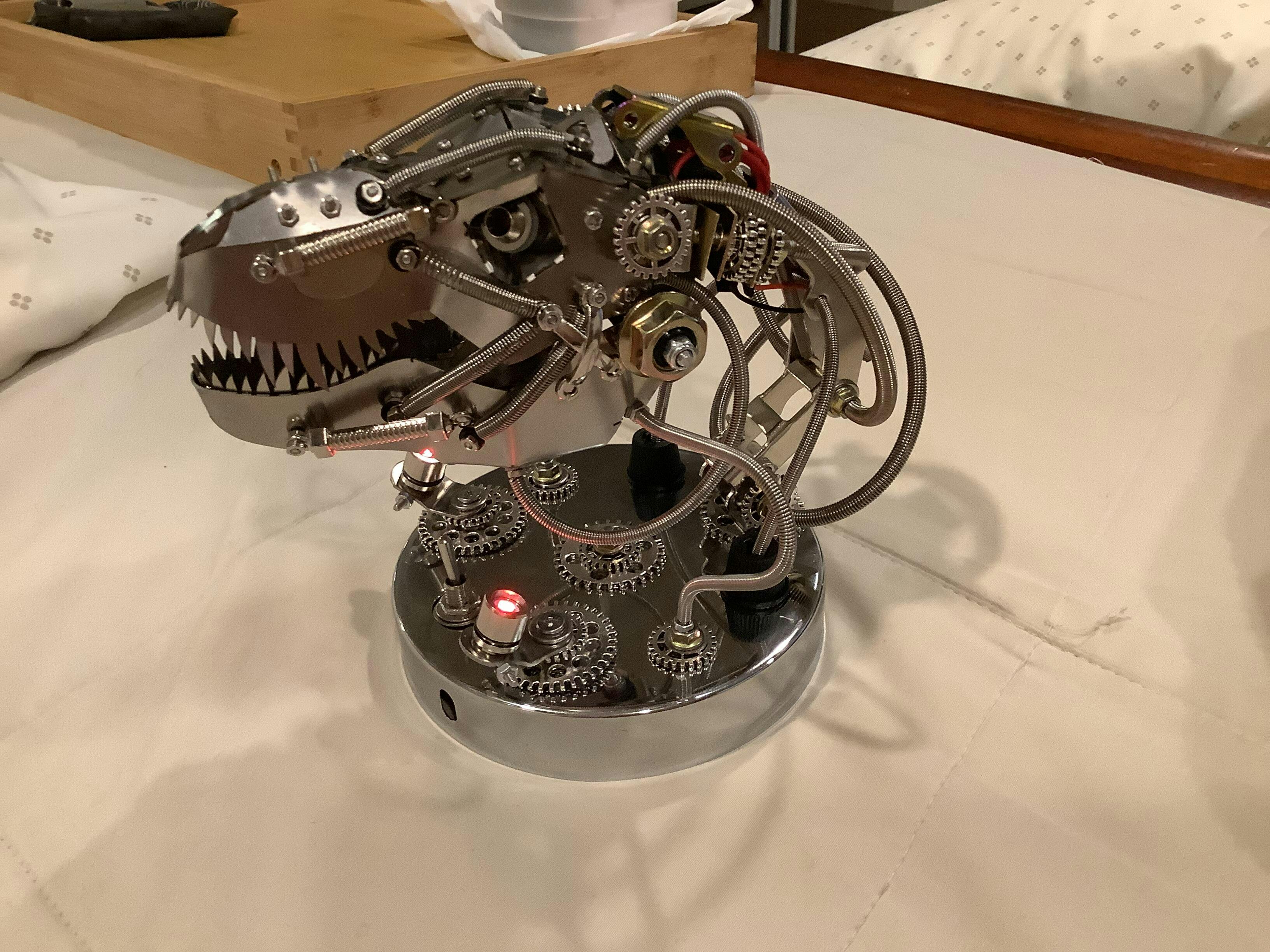.Way to play/assemble: Metal flat parts come with bendable wires for changing the model into appropriate shapes. Assembled through the screws and then equipped with two AA batteries prepared by yourself, the T-rex skull model features a mouth opens and closes repeatedly and glowing eyes with LED lights, providing an amusing toy allowing you to put a pen into or finger the mouth for relaxing.