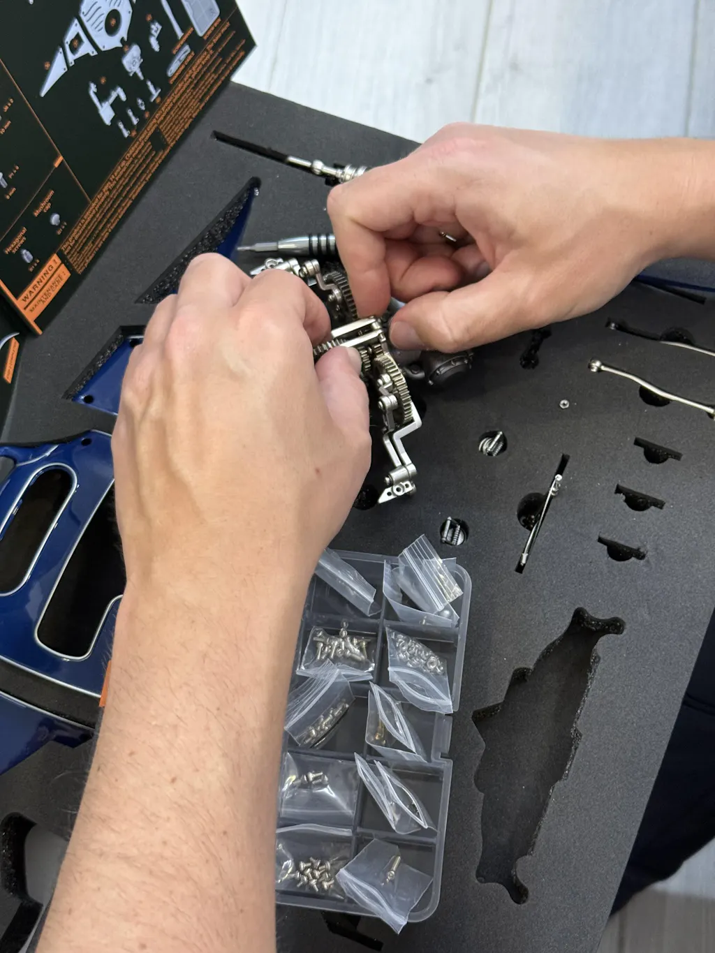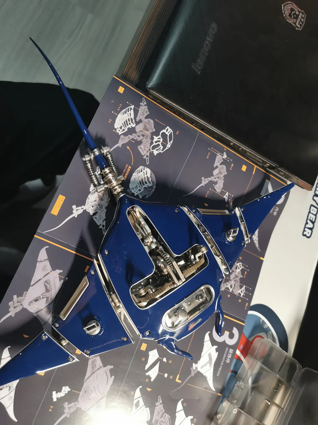 The assembly kit for building a flying Mobula ray is meticulously organized, with each part labeled and numbered for easy identification. It also comes with a detailed assembly guide that includes step-by-step instructions for building your own flying Mobula ray. The guide is illustrated with clear diagrams and explanations, making it easy for builders to follow along and assemble the kit accurately. Each step is accompanied by a list of the required parts and tools, ensuring builders have everything they need at hand before proceeding.