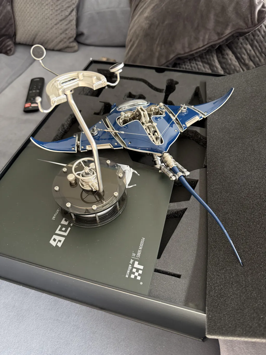 This is the mechanical mobula manta ray kinetic sculpture - a scale model inspired by the grace and beauty of the original mobula. Species of this genus are often collectively referred to as "devil rays", "flying mobula", or simply "flying rays", due to their propensity for breaching, sometimes in a spectacular manner. Mobula rays live in warm oceans throughout the world. The fins help the rays rocket from the sea when they leap. The Manta Ray grows to a wingspan of 17 feet and consumes small fish and plankton. It also has the largest brain of any fish in the sea. These manta rays gather in groups and leap out of the surface into the air up to around two meters before splashing back into the water. This unit has 200+ metal accessories that emulate the soothing motion of flying through water. You can imagine how complicated it was to set up the smooth movement of the fin. Just click the button, and the metal mobula is ready to fly, as the gears in its body will start to rotate, driving the wings to fly. Wheeeee !!! And it's more interesting to find that it adjusts the speed of the swing activity and the brightness of the lights with the buttons.