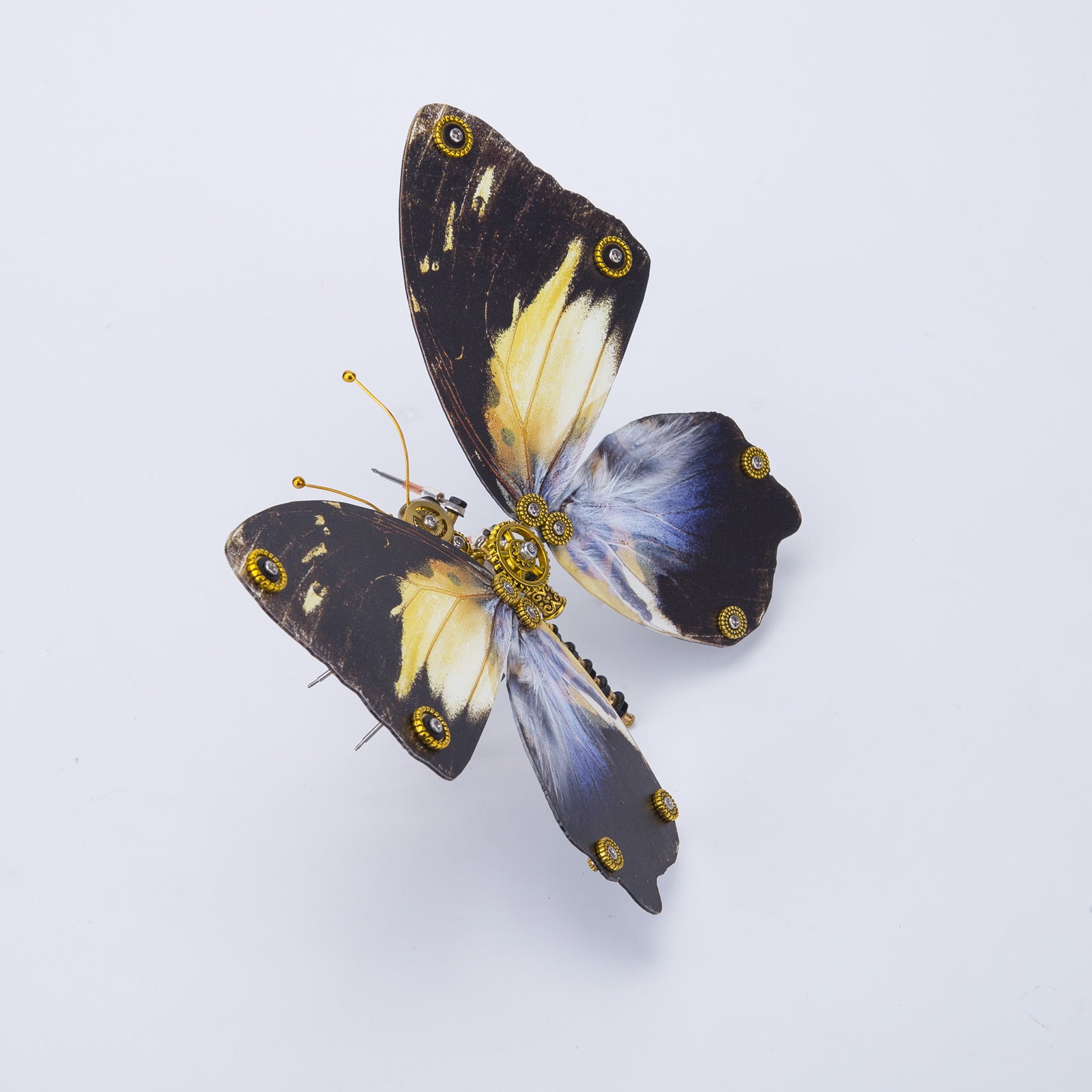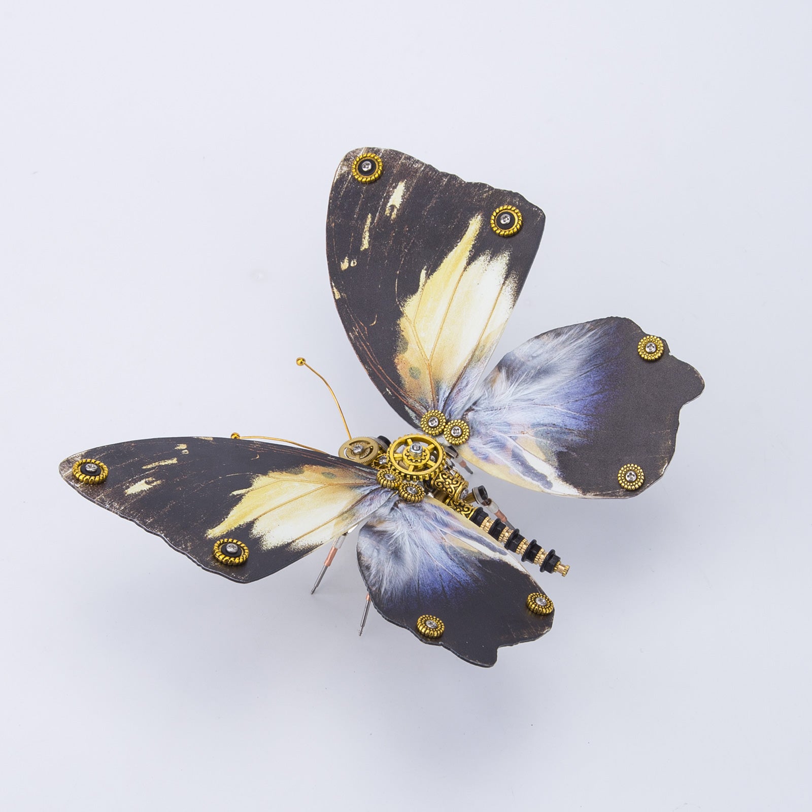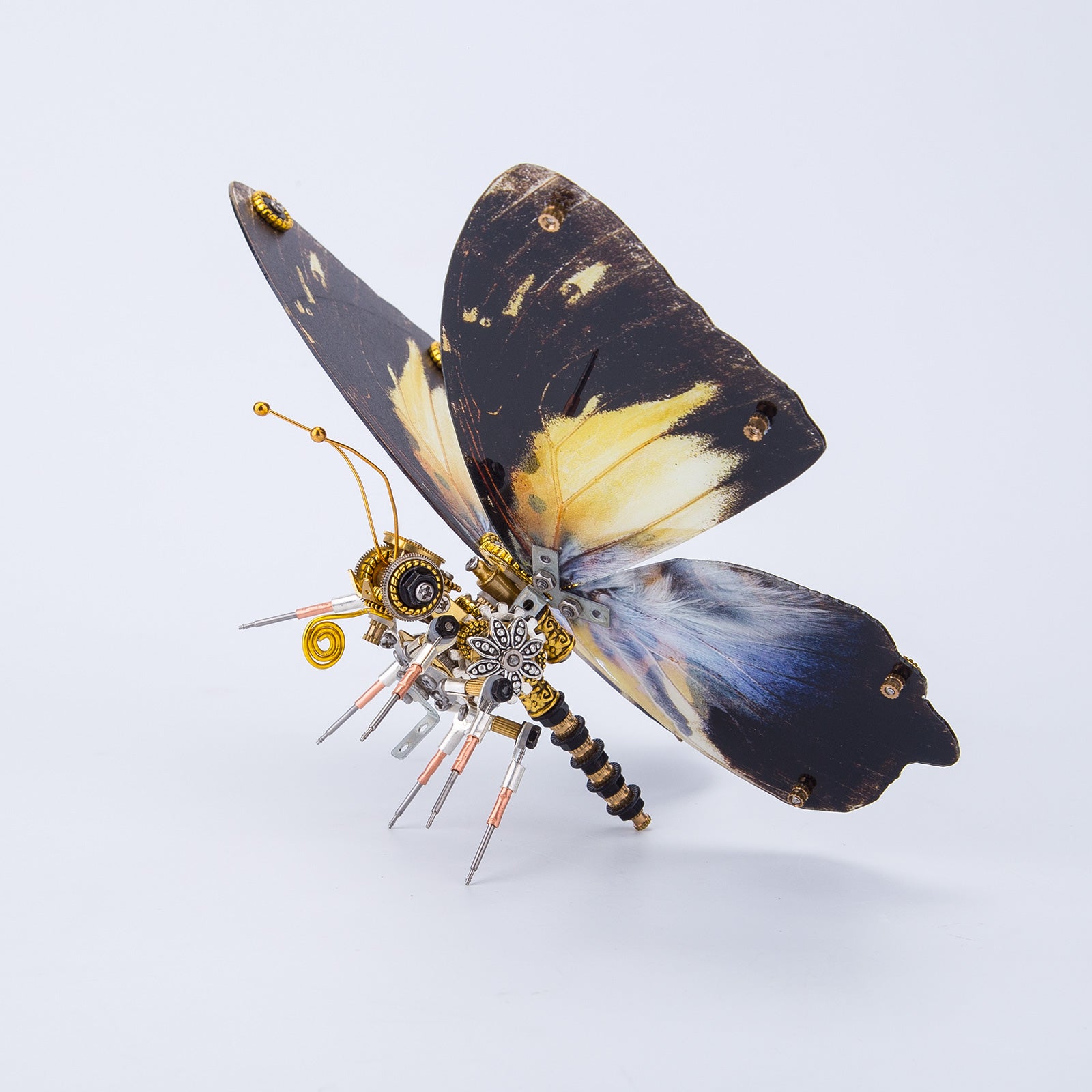 .The model is made of premium-quality metal materials including stainless steel, iron and copper with many carved parts to create a retro steampunk style. Features visible wings texture with a thickness of 3-4mm for wear resistance, restoring the real butterfly wings.